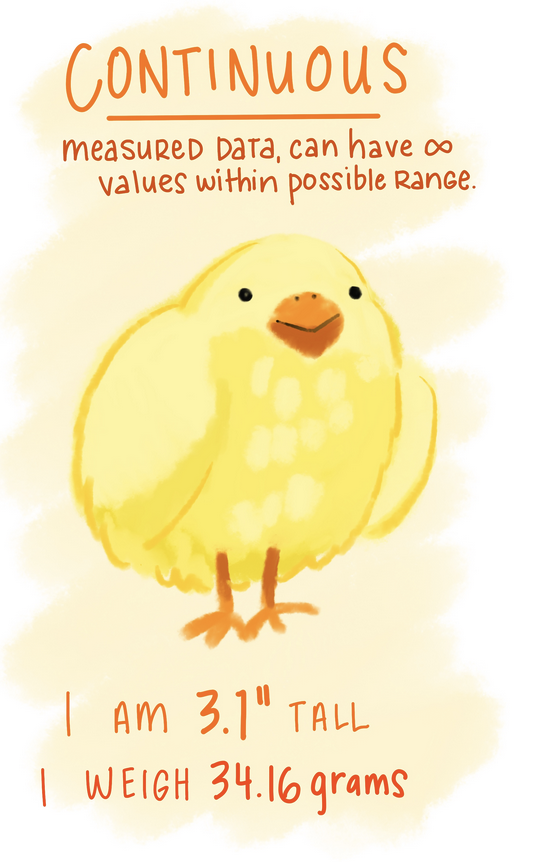 An illustration of a chick, with text “Continuous - measured data, can have infinite values within possible range. I am 3.1” tall, I weight 34.16 grams.”