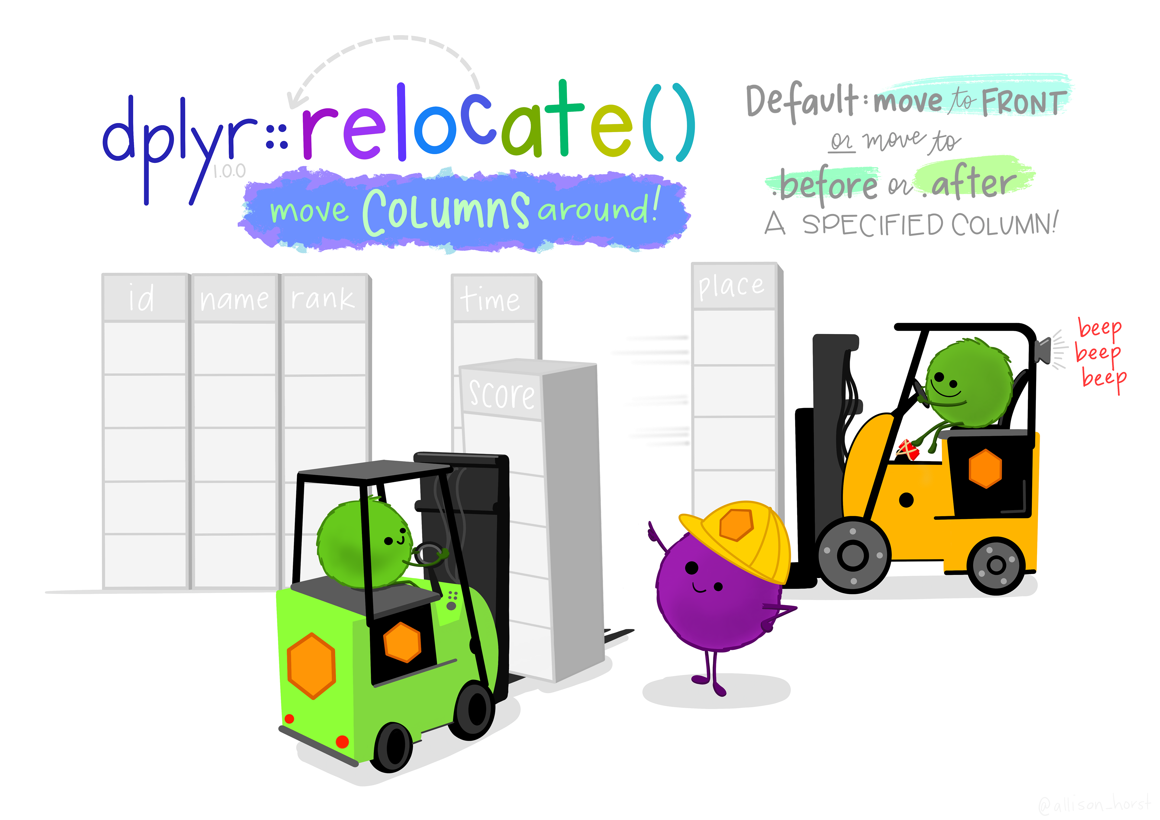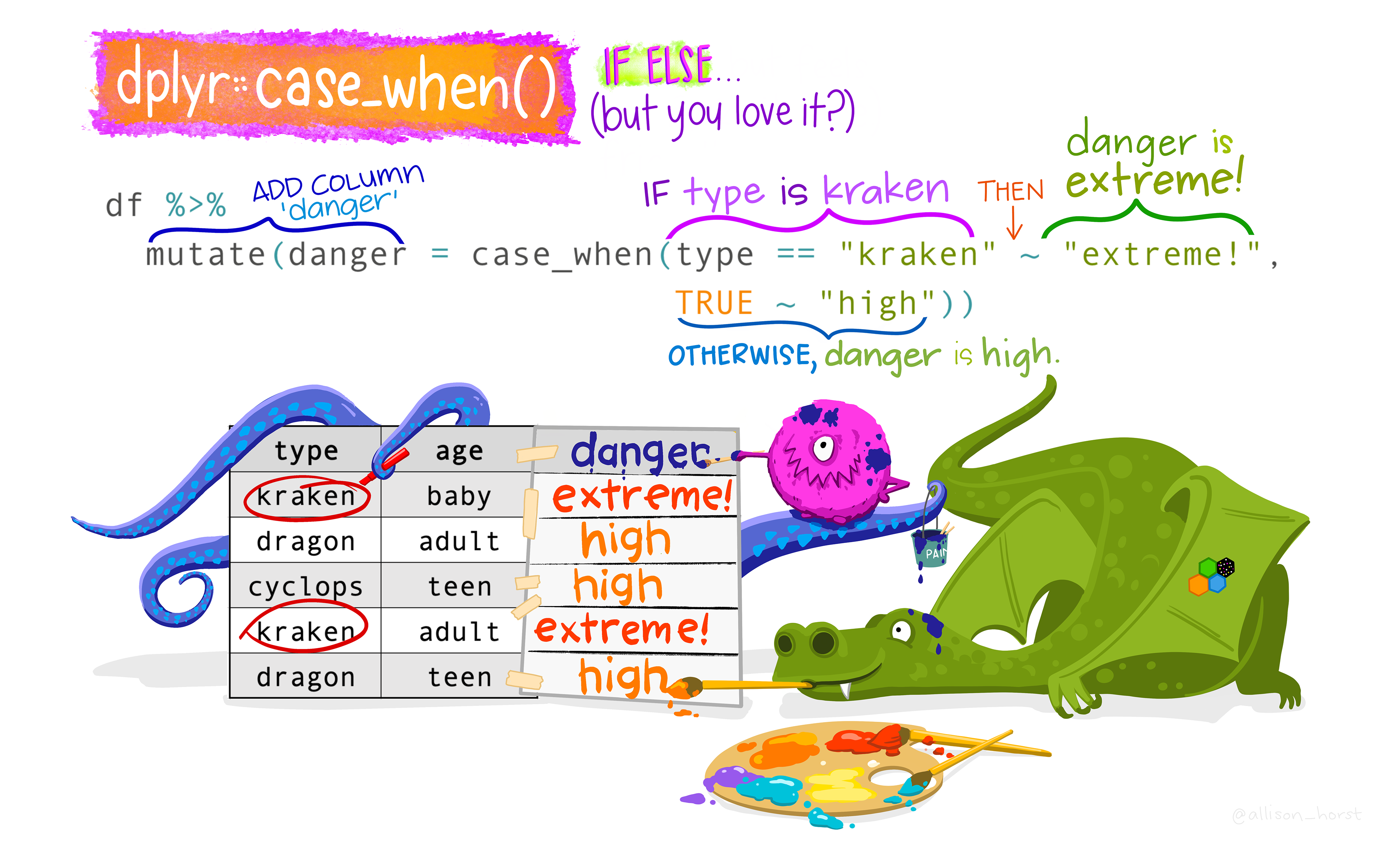 filter(): Returns a subset of the rowsselect(): Returns only the listed columnsrename(): Renames the variables listedmutate(): Adds columns from existing datarelocate(): Moves the order of the columnsarrange(): Sorts the rows by the value of a variablecase_when(): A useful expansion ofifelsesummarise(): Reduces each group to a single row by calculating aggregate measuresgroup_by(): Groups a data set on a factor variable, such that all functions performed are then done on each level of the factor