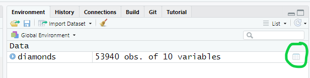 diamonds <- ggplot2::diamondsTo see the raw data values, click on the square spreadsheet icon to the right of the data set name in the top right panel of RStudio (circled in green in the image below).